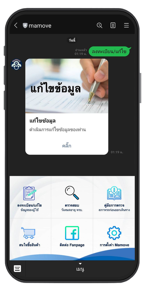 สเเกน QR Code ที่สติ๊กเกอร์ เพื่อ Add Line Mamove และกดเข้าเมนูลงทะเบียนเพื่อกรอกข้อมูลรถผู้ใช้ พร้อมกรอกรหัสลงทะเบียนที่ได้รับ ในขั้นตอนสุดท้าย ก็เป็นอันเสร็จ